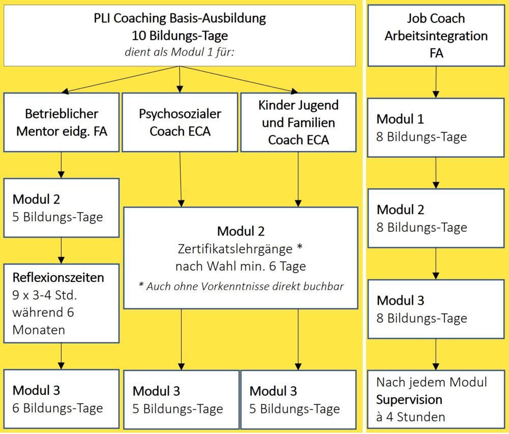 Die Ausbildungsmodule der Praxis für Lösungs-Impulse werden in diesem Diagramm dargestellt.